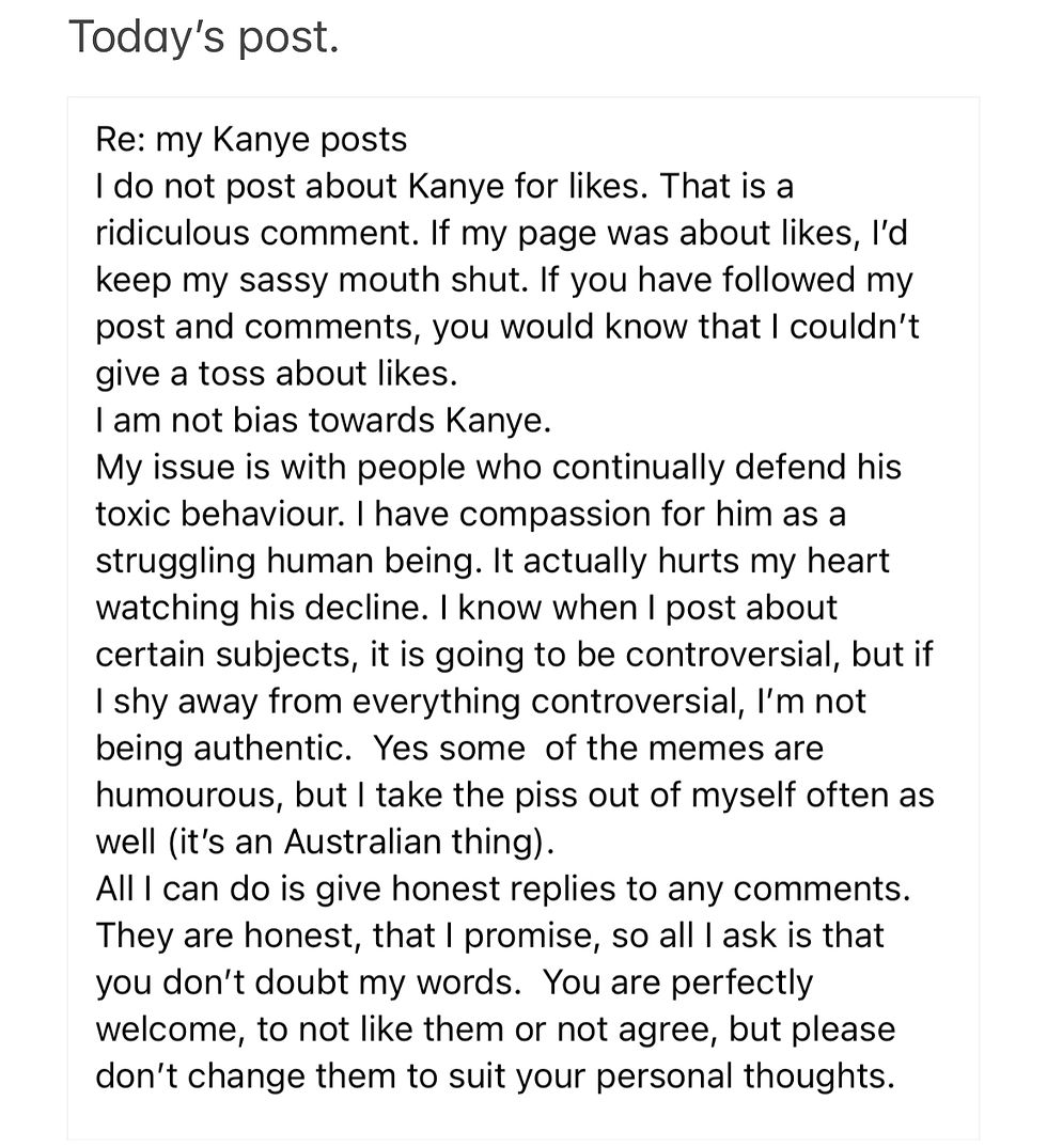I know it wasn't about likes, but was it mean? Am I just justifying? I didn't think so, but we share memes so easily, without consequence, or accountability. I feel like I call Kanye's fans out, more than him. I see his behaviour as speaking for itself. It's the defending of it I struggle with.